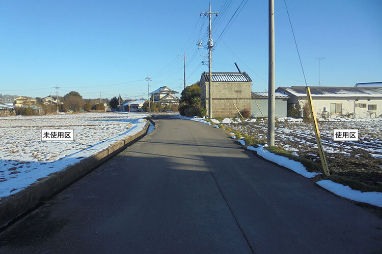 上空写真右側のウッスラとした雪解けの様子が【触媒ネット】使用の圃場で、左側3枚の圃場は未使用。同様に、目線写真も道路を隔てて右側が【触媒ネット】使用の圃場で、左側が未使用の圃場になります。